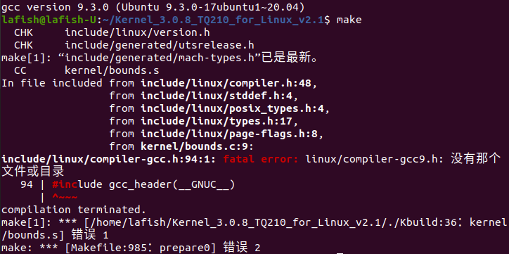 天堑提供的源代码是 3.0.8 的,之前安装的 arm-linux-guneabi-gcc 版本太新,所以不能编译旧的内核代码。下面出现的很多报错,都是编译工具太新导致的。