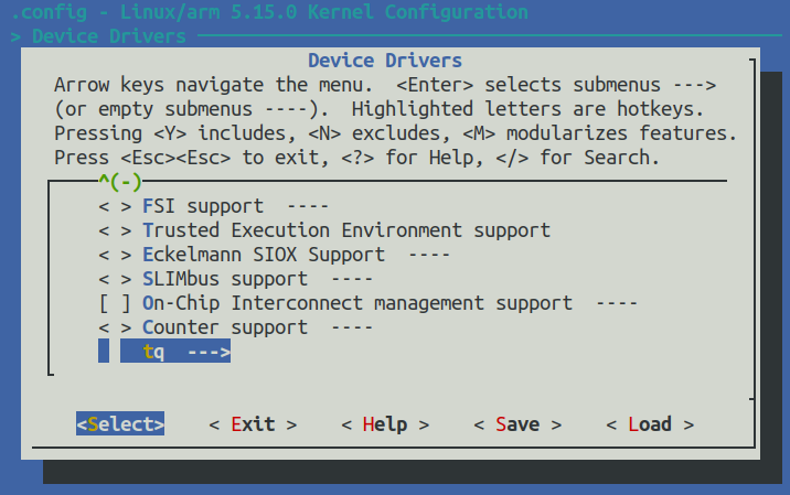 这样就能在配置界面的 Device Driver 最后一项看到新选项了,全部勾选就能把驱动编译进内核。